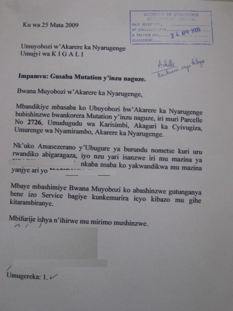 document type Stamped application letter (Kigali district land)
